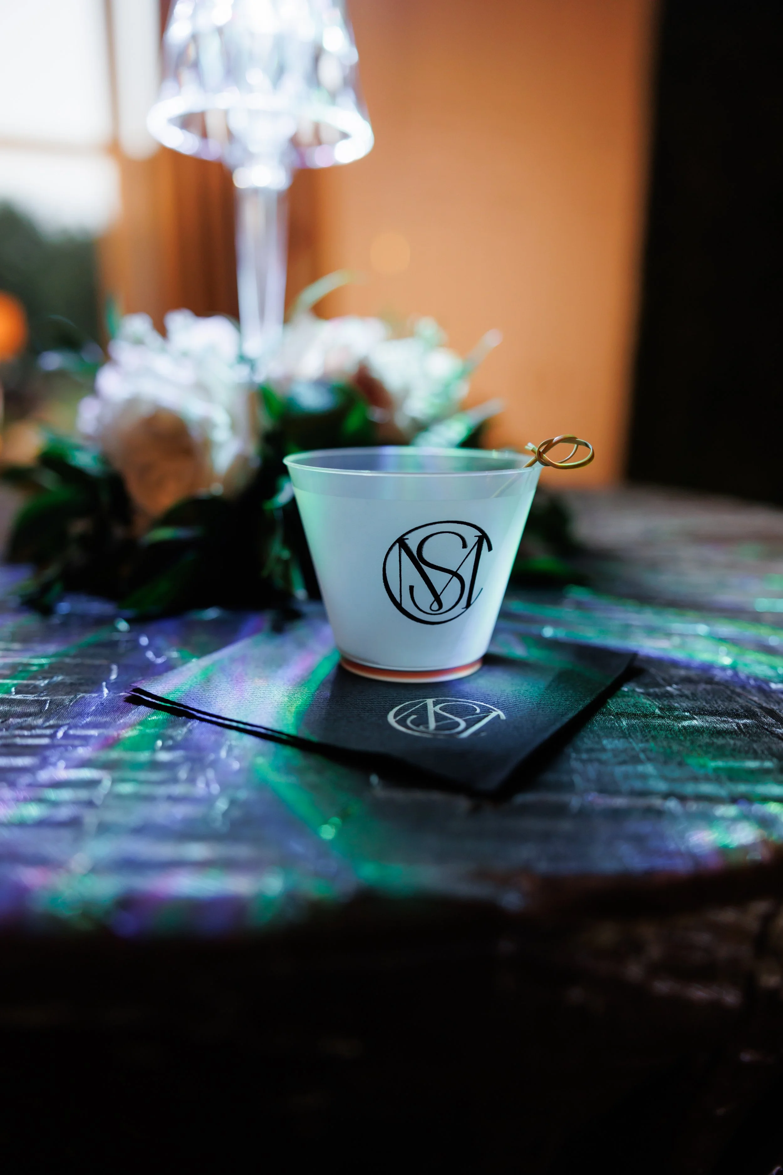 Digital Brand Presentation: Your mark showcased in a curated presentation featuring event-day mockups (such as cocktail napkins and wax seals) to help you visualize your brand in action.